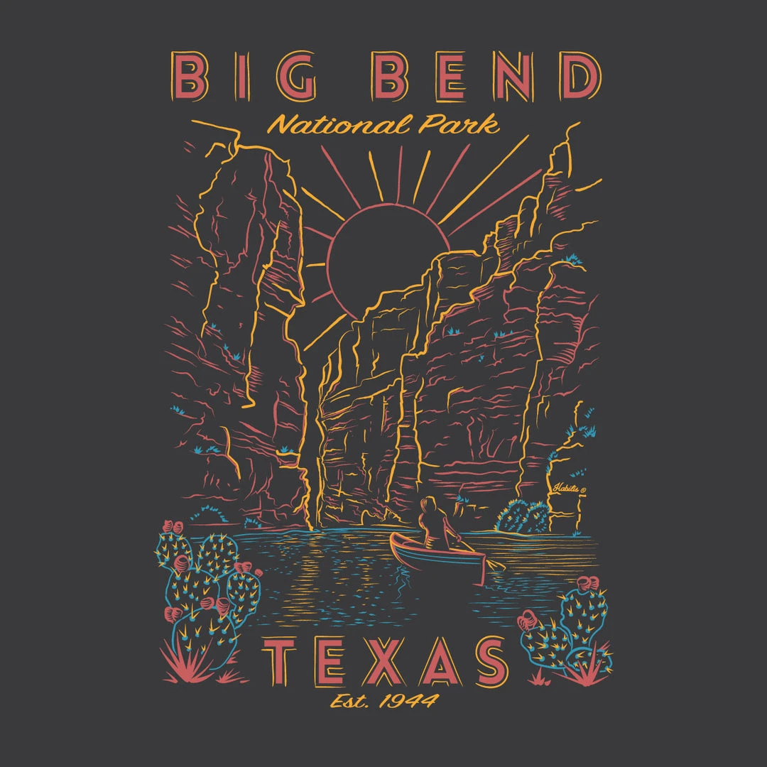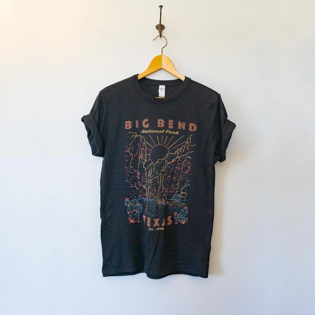 Premium vintage jersey fabric in a unisex crew-neck cut, featuring Big Bend National Park, in Texas.