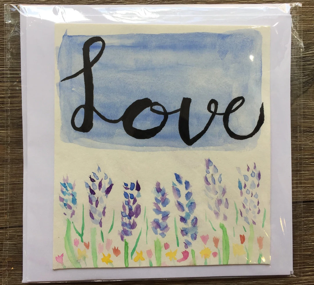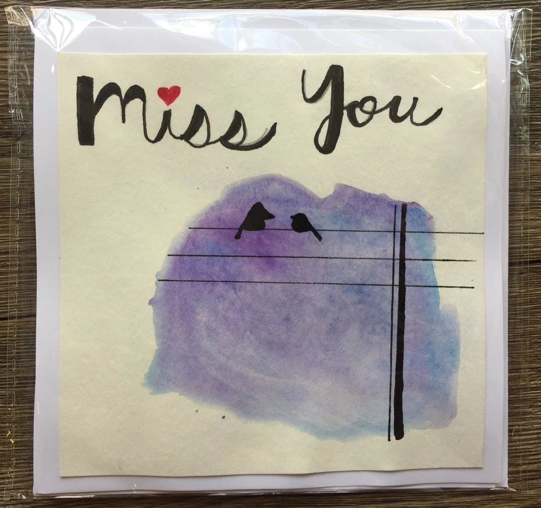 Each card is drawn by hand, and hand painted with water colors. Blank inside so that you can leave your own message as unique as each one of these cards are.