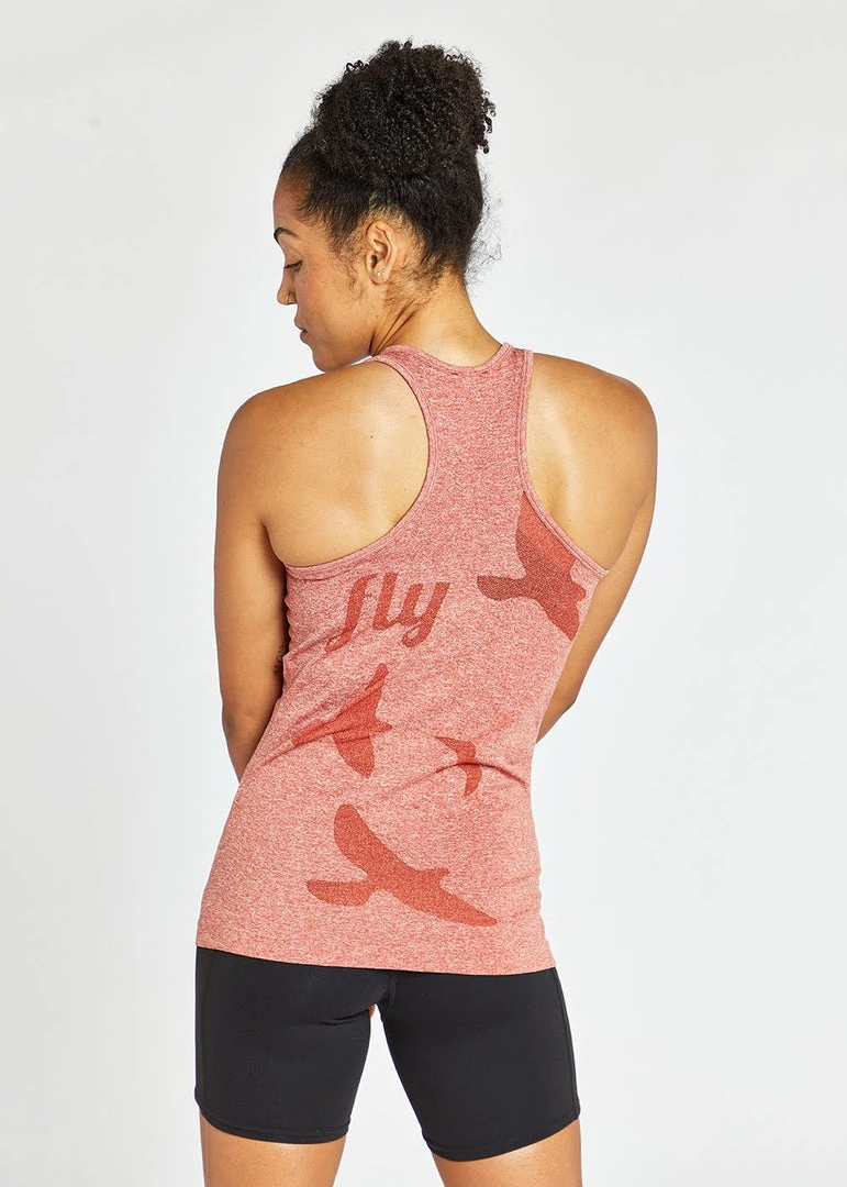 An essential style in the O line! It’s the tank that goes with everything. This seamless design, long and slightly shaped, has a versatile racerback design, gentle scoop neck, and iconic drop stitch birds.