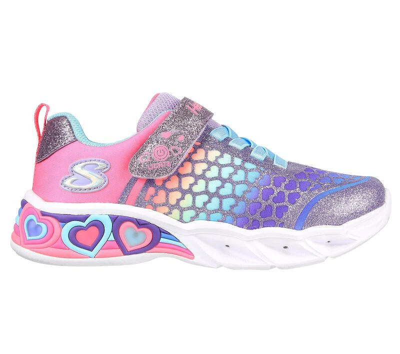 Cute light-up style and all-day comfort combine in Skechers Heart Lights: Sweetheart Lights – Lovely Colors. This casual lightweight slip-on features a rainbow ombre mesh and synthetic upper with heart details and a light-up midsole.